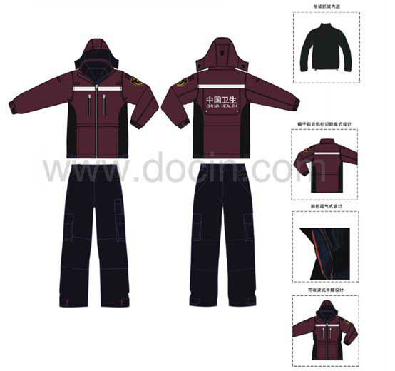 “中國衛(wèi)生應(yīng)急服裝”是由冬裝/春秋裝、馬甲、夏裝、圓領(lǐng)衫、戶外帽、戶外靴、臂章等幾部分組成。