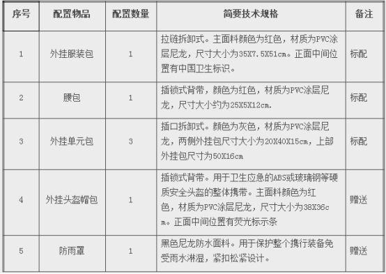 主面料采用國旗紅色,并符合《衛(wèi)生應(yīng)急毒物個(gè)人攜行裝備技術(shù)規(guī)范(試行)》相關(guān)規(guī)定。內(nèi)部單元包采用綠色,外掛包采用灰色。